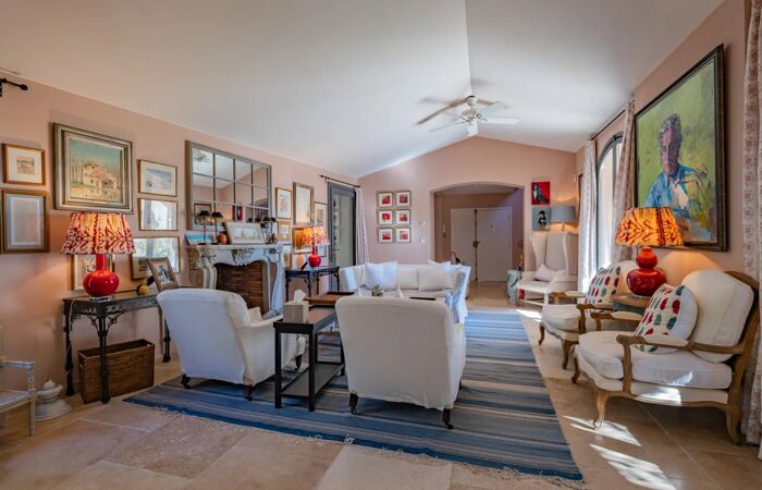 Édifiée sur un terrain paysager, cette propriété de charme déploie de généreux volumes baignés de lumière naturelle. Elle se compose de sept chambres, dont une suite indépendante idéale pour recevoir famille, amis ou personnel. Le double séjour, spacieux et élégant, s’ouvre sur de vastes terrasses ensoleillées, parfaites pour des moments de détente ou de réception.