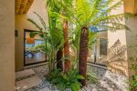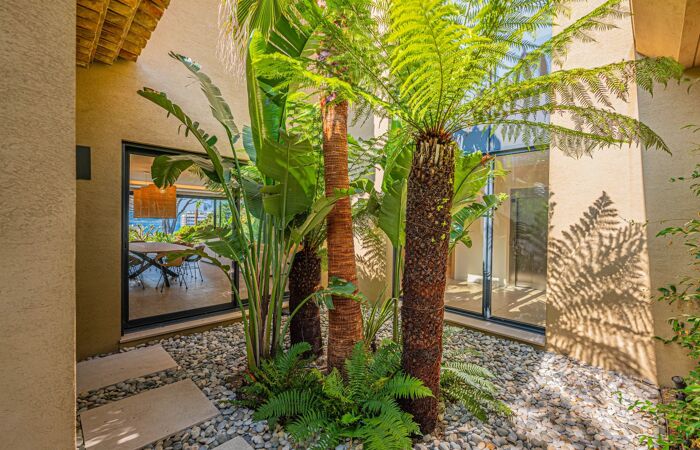 Le jardin, plat et paysager, a été conçu par un architecte renommé, créant un écrin de verdure harmonieux et raffiné.