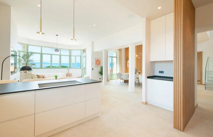 L'entrée dessert une magnifique réception avec sa salle à manger et cuisine avec cellier qui bénéficient d'une hauteur sous plafond exceptionnelle. A ce niveau une suite de maitre avec un accès direct à la terrasse sans vis-à-vis.