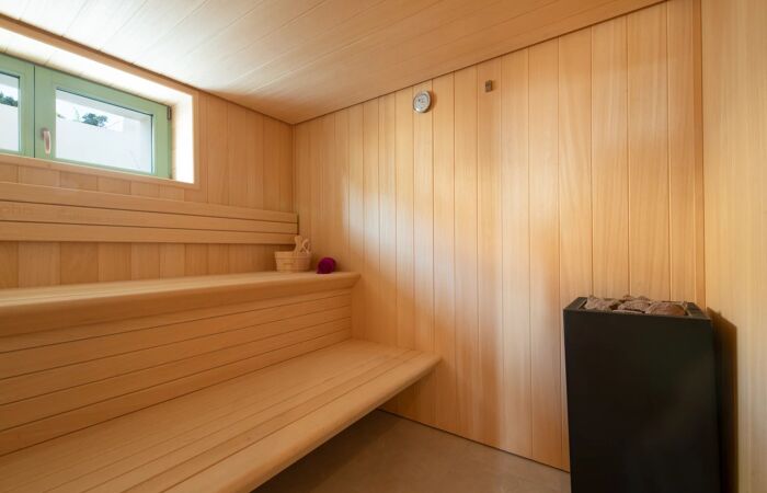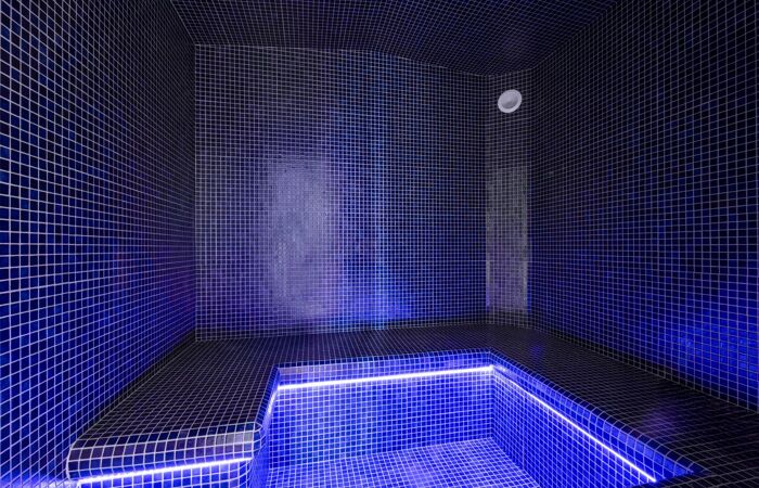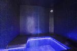 Un espace fitness avec une salle de sport, un hammam et un sauna.
