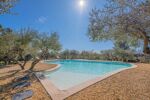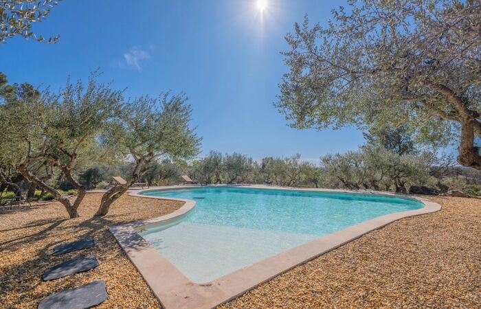 À l’extérieur, le jardin paysager, ponctué d’oliviers majestueux, entoure une piscine au sel de 11 x 6 mètres, parfaitement intégrée dans un environnement naturel préservé.