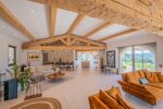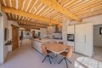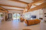 Dès le seuil franchi, la générosité des volumes et la lumière naturelle impressionnent. La pièce principale, d’environ 90 m², se distingue par ses plafonds cathédrale et ses larges baies escamotables, s’ouvrant plein sud sur près de 200 m² de terrasses enveloppant la maison. En hiver, le salon devient un refuge convivial autour de l’insert, diffusant une chaleur feutrée. La cuisine italienne, au design résolument haut de gamme, séduit par ses façades vitrées au toucher soyeux et son plan de travail en quartz ; elle se prolonge par une arrière-cuisine/buanderie.