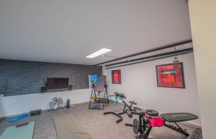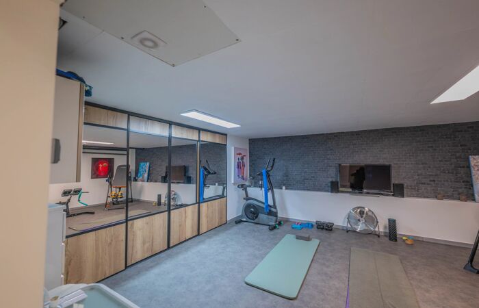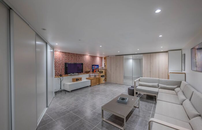 Le sous-sol, accessible de l’intérieur, est consacré au garage pour 4 véhicules, avec borne de recharge, et aux loisirs : espace fitness, home cinéma, cave à vin climatisée.