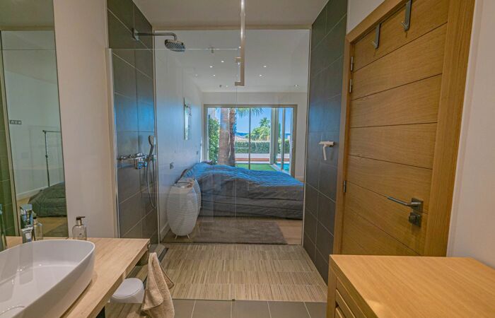 Elle se compose d’une entrée, d’un vaste séjour lumineux avec salon ouvrant sur la terrasse et la piscine, face à la mer, ainsi que d’une cuisine ouverte entièrement équipée et 2 belles chambres en suite.