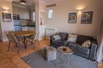 Lappartement se compose dune suite parentale spacieuse avec salle de bains et WC, dune chambre lumineuse supplémentaire, dune salle deau moderne avec WC, ainsi que dune cuisine aménagée et entièrement équipée ouverte sur un séjour avec un canapé lit confortable.