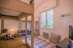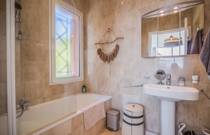 L'intérieur se compose d'un séjour lumineux et spacieux, offrant un accès direct à une belle terrasse exposée plein sud, où vous pourrez profiter du soleil et admirer la vue sur la mer. La cuisine est entièrement équipée et indépendante, vous permettant de préparer de délicieux repas pendant votre séjour. Deux chambres 'en suite' avec salle de bains/eau et une troisième chambre avec deux lits superposés avec sa salle d'eau, offrant un maximum d'intimité et de confort.