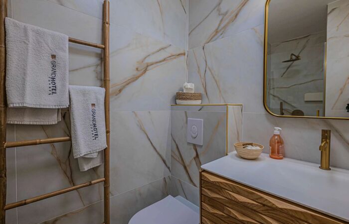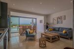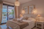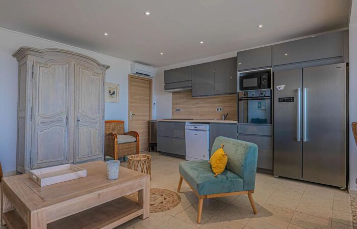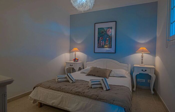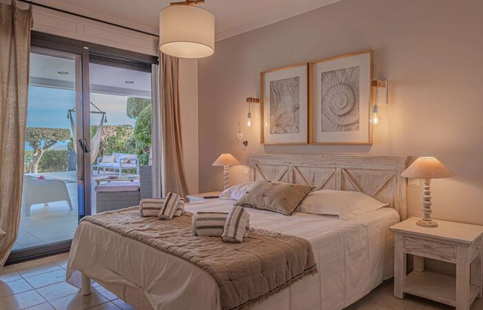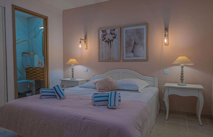 Ce bas de villa privatisé et son entrée également : se compose de trois belles chambres doubles : une première chambre double et sa jolie vue mer et piscine ; sa salle de de douche attenante une seconde chambre double et sa salle de douche attenante, une troisième chambre double, un coin bureau, un séjour ouvert sur la vue piscine et mer. Un coin salon pour partager un repas avec ses proches.