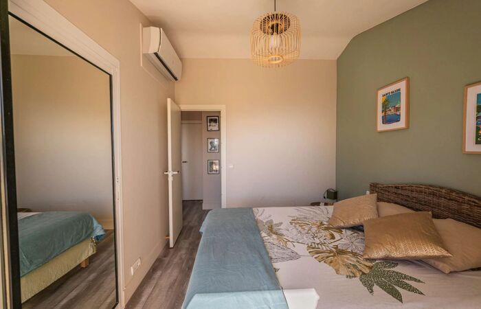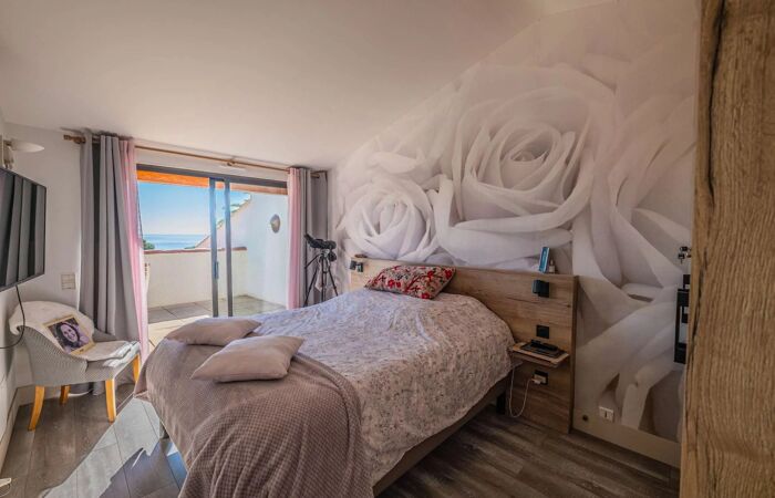 À létage, deux chambres doubles partagent une belle terrasse avec vue sur la mer. Une salle de bains et des toilettes complètent cet espace nuit.
