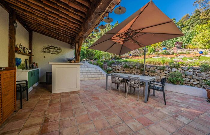 À lextérieur, profitez de plusieurs terrasses aménagées avec coin repas, salon de jardin, cuisine dété, plancha à gaz et barbecue Kamado, le tout au cur dun agréable jardin arboré.