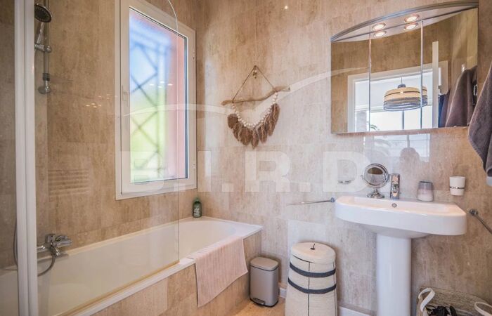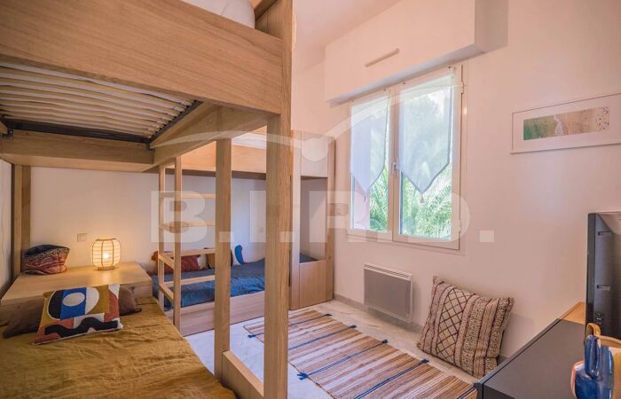 L'intérieur se compose d'un séjour lumineux et spacieux, offrant un accès direct à une belle terrasse exposée plein sud, où vous pourrez profiter du soleil et admirer la vue sur la mer. La cuisine est entièrement équipée et indépendante, vous permettant de préparer de délicieux repas pendant votre séjour. Deux chambres en suite avec salle de bains/eau et une troisième chambre avec deux lits superposés avec sa salle d'eau, offrant un maximum d'intimité et de confort.