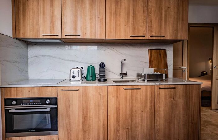 La cuisine est entièrement équipée : réfrigérateur, plaques de cuisson, micro-ondes, cafetière, grille-pain, bouilloire tout est prévu pour rendre votre séjour agréable.