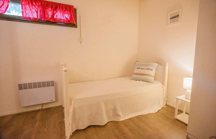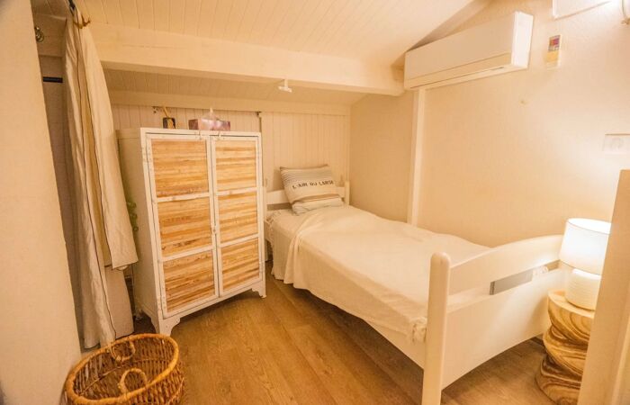 Premier étage : une chambre double (160x190cm) donnant sur sa terrasse privative avec une vue mer panoramique ; sa propre salle de douche attenante. Une seconde chambre double du côté entrée de l'appartement (140x190cm) ; un wc invités.