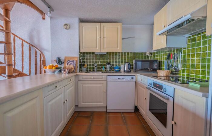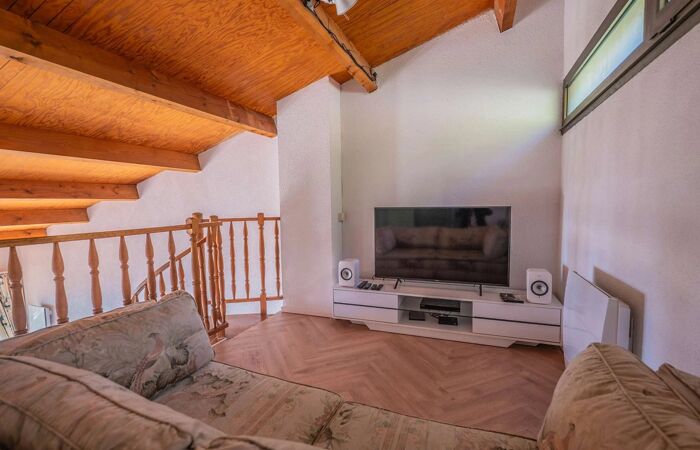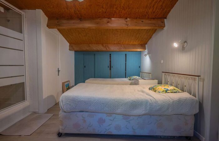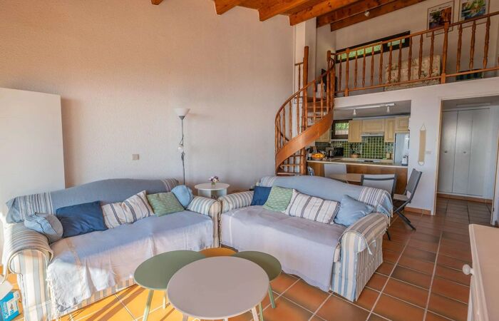 Lappartement se compose dune entrée, dune cuisine ouverte entièrement équipée donnant sur un vaste séjour/salle à manger lumineux, une chambre (lit : 160x200cm) avec une salle de bains et toilettes indépendantes. À létage, une mezzanine aménagée accueille une deuxième chambre (2 lits simples) avec sa salle de douche et WC.