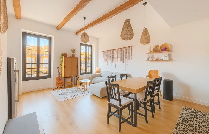 Quartier WILSON - 4 pièces -Traversant - Étage élevé Au sein d’un bel immeuble niçois en pierre, découvrez ce appartement de 4 pièces traversant, situé au 4-ème et avant dernier étage et avec ascenseur. Cet appartement vous séduira par son vaste séjour de 28 m² baigné de lumière, aux poutres apparentes, sa cuisine ouverte entièrement équipée, ainsi que ses volumes généreux. Composition : Entrée, Spacieux séjour, Cuisine ouverte aménagée et équipée, Deux chambres lumineuses, Une suite parentale avec salle d’eau, dressing et WC, une Salle de bains supplémentaire avec WC. Grande cave en sous-sol.