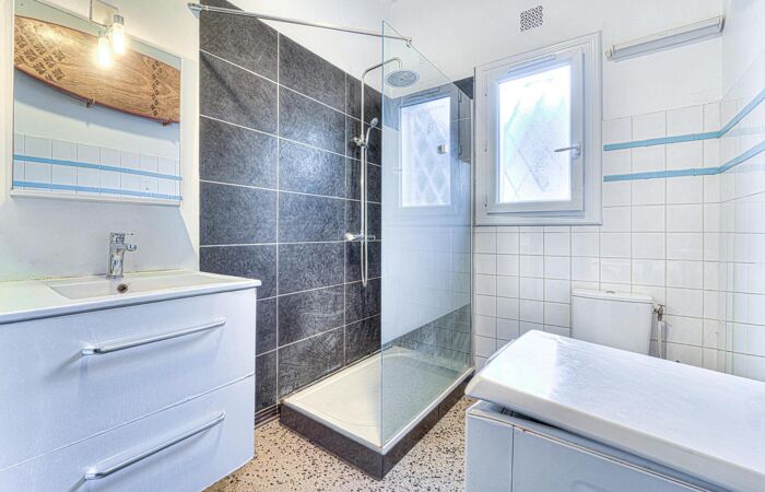 L'appartement se compose d'une entrée avec placards, d'une grande pièce à vivre lumineuse avec cuisine américaine, et d'une salle de douche spacieuse.