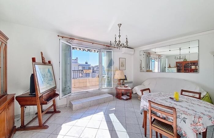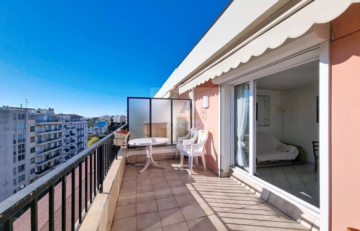 2P DERNIER ETAGE - TERRASSE / CALIFORNIE Sur l'Avenue de la Californie, un peu avant les Bosquets, au 8ème et DERNIER ETAGE avec ascenseur ! Agréable 2 pièces de 55m² traversant composé d'une entrée, séjour donnant sur une belle terrasse à ciel ouvert de 10m² exposée Sud-Est, cuisine indépendante, chambre avec placard de 13.52m², salle de bains, Wc et dressing. Achat d'un GARAGE possible en sus au prix de 30.000euros