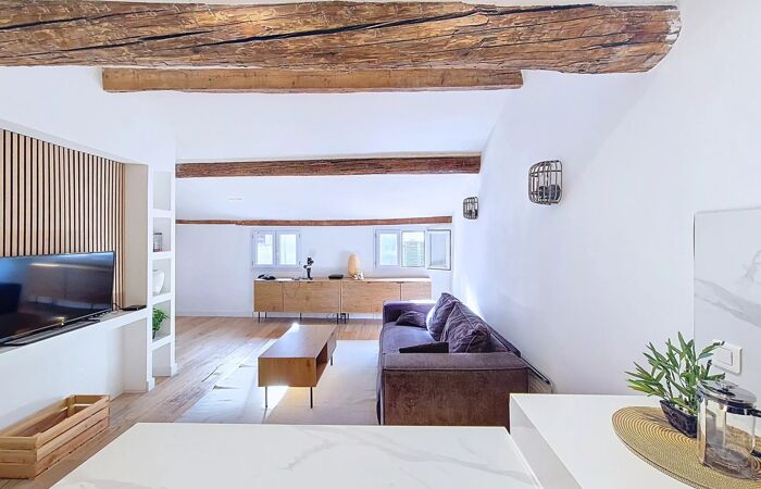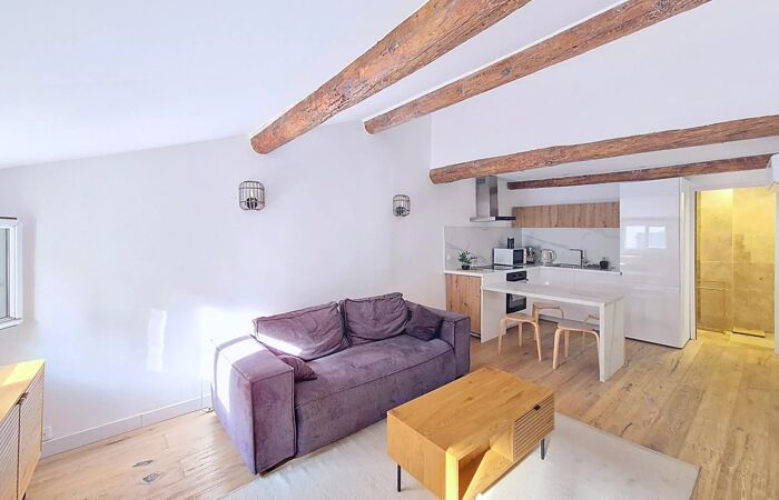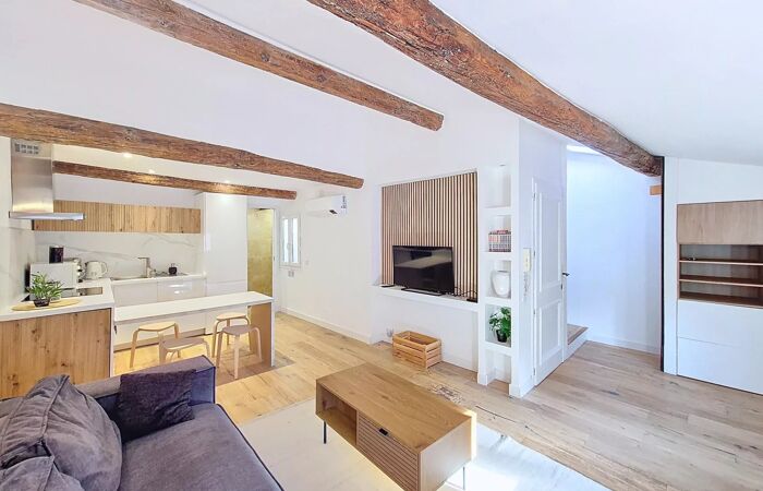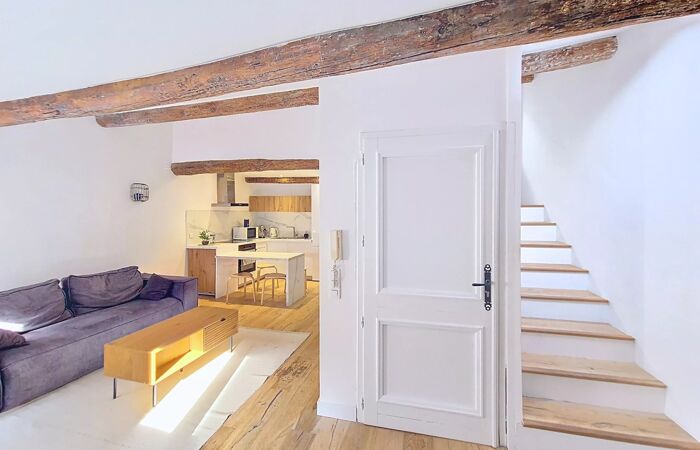 Duplex 2 pièces 43m2 Découvrez cet appartement DUPLEX chaleureux de 43,25 m² (47m2 habitables) idéalement situé dans le quartier pittoresque de Vieux Nice. AU 5ème et DERNIER ÉTAGE avec une CHAMBRE à coucher au CALME et ses POUTRES APPARENTES, le confort moderne avec un charme authentique. Les fenêtres en DOUBLE VITRAGE et PVC assurent une isolation thermique et acoustique optimale, tout en permettant une belle lumière naturelle reflétée sur son PARQUET MASSIF. Une grande pièce à vivre de 28m2 avec sa cuisine moderne ouverte, EQUIPÉE et prête à répondre à toutes vos envies culinaires. Ce bien immobilier est une rare opportunité d'habiter ou d'investir dans l'un des quartiers les plus recherchés de Nice. La location saisonnière y est autorisée. Le mélange de modernité et de traditions locales confère à cet appartement un attrait indéniable pour quiconque souhaite profiter de la vie méditerranéenne dans un cadre historique.