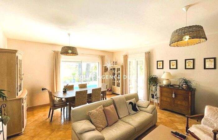 Très belle villa de 6 pièces 131M² au calme soigneusement entretenue, qui se compose de plain pied d'un hall d'entrée, d'un vaste séjour exposé Sud et Est, avec cheminée et en accès direct à une véranda et à la terrasse - piscine, d'une cuisine équipée ouverte sur la véranda.