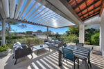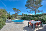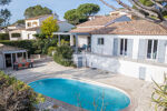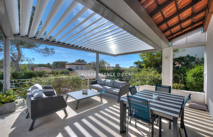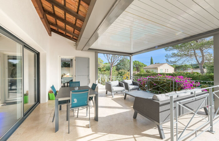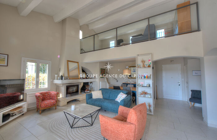 Située dans un domaine privé au coeur des golfs, charmante villa en parfait état, entièrement de plain pied et rénovée avec goût , elle comprend 3/4 chambres plus une mezzanine pouvant servir de chambre d'appoint ou de bureau, un séjour cathédrale avec cuisine ouverte toute équipée, sortant sur une belle terrasse plein sud en partie protégée par une pergola bioclimatique et vue dégagée.