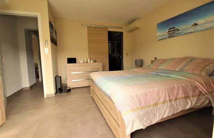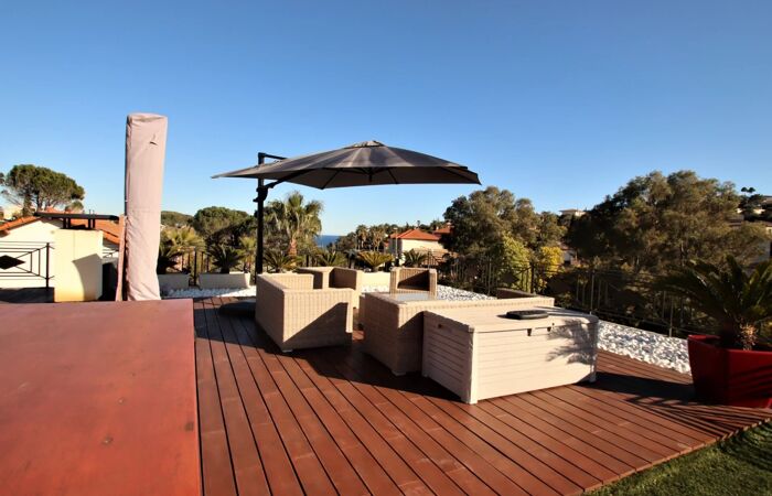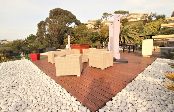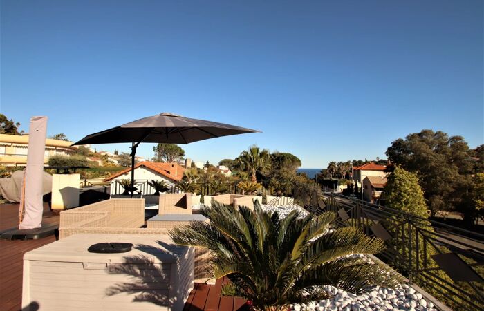 Appartement toit terrasse T4 Toit-Terrasse avec Ascenseur Privatif Rare & Exceptionnel – Sublime Toit-Terrasse avec Ascenseur Privatif à Mandelieu-La-Napoule À seulement 10 minutes à pied du Château de Mandelieu-La-Napoule, des plages et des restaurants, découvrez ce somptueux appartement en dernier étage, un véritable havre de paix où se mêlent l’élégance contemporaine et le charme provençal. Ce bien d’exception offre une surface de 112 m² avec de magnifiques espaces extérieurs. Une première terrasse de 31 m² permet de savourer vos petits-déjeuners ensoleillés, tandis qu’un toit-terrasse spectaculaire de 118 m², accessible par un ascenseur privatif, se divise en deux espaces distincts : un coin détente avec pelouse synthétique et transats pour admirer la vue imprenable sur le massif de l'Estérel et un aperçu mer, ainsi qu’un espace barbecue idéal pour des moments de convivialité sous le ciel azuréen. À l’intérieur, vous serez séduit par un séjour baigné de lumière de 35 m², ouvert sur une cuisine équipée de 14 m². L’appartement dispose de deux chambres, dont une magnifique suite parentale avec salle de douche et dressing. Un bureau et une buanderie viennent compléter cet agencement fonctionnel et raffiné. Pour un confort optimal, l’appartement est entièrement climatisé avec un système réversible chaud/froid et une cheminée moderne, créant une atmosphère chaleureuse en toute saison. Parmi les prestations exclusives, ce bien dispose d’un ascenseur privatif menant directement au toit-terrasse, d’un garage récent et sécurisé, ainsi que de deux places de parking extérieures et d’un box couvert. L’ensemble est vendu avec tout l’équipement du toit-terrasse. Un bien unique et rare, alliant confort, luxe et art de vivre méditerranéen.