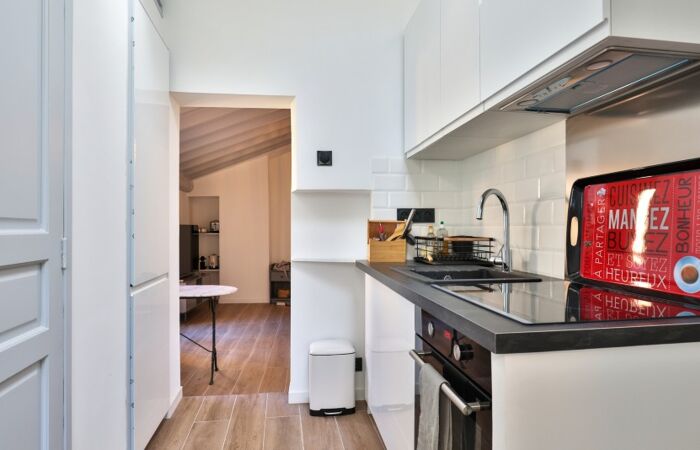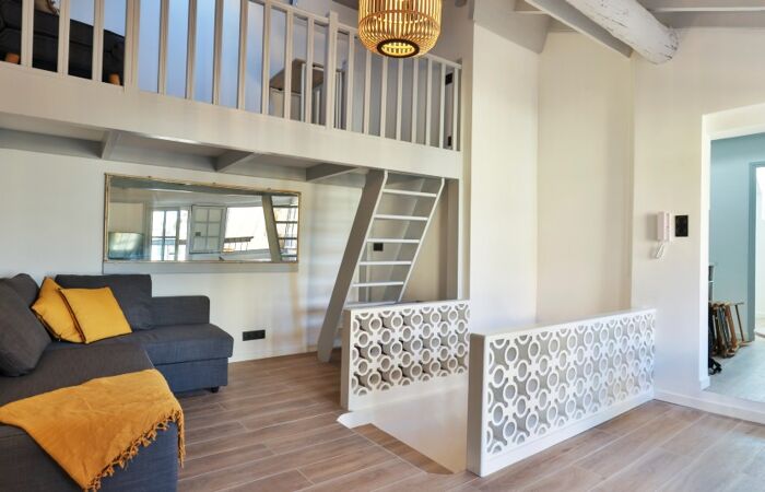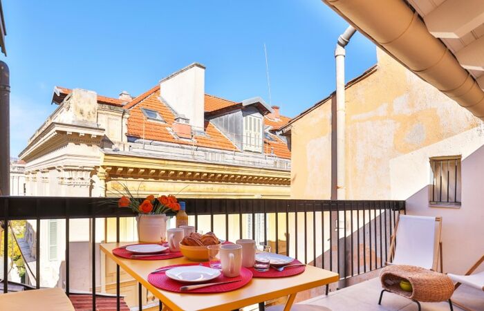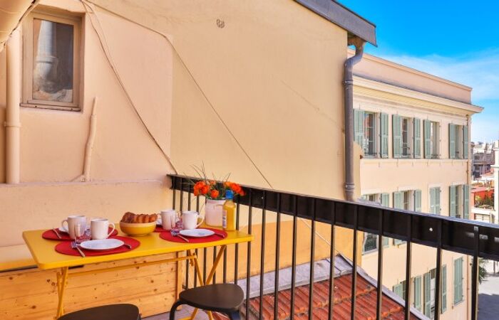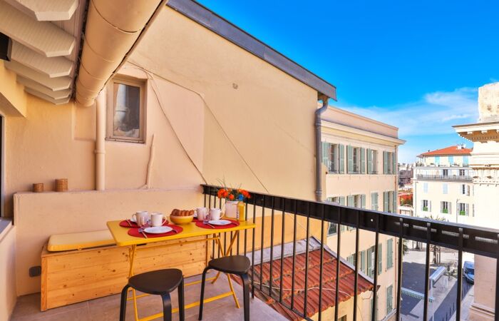 NICE - Vieux Nice - Cours Saleya -Appartement climatisé 2 pièces de 37 m² en dernier étage, entièrement rénové avec goût, au calme et profitant d'une terrasse exposée Ouest avec une très jolie vue sur le Marché aux Fleurs et la rue Alexandre Mari.