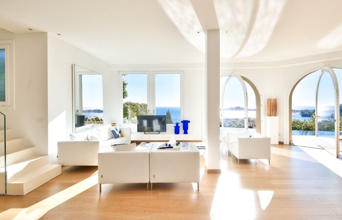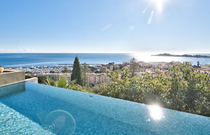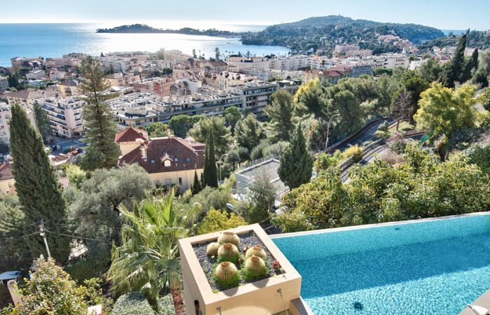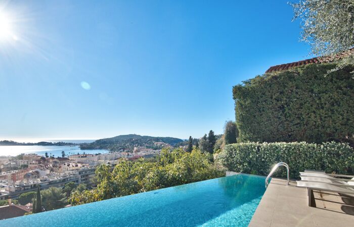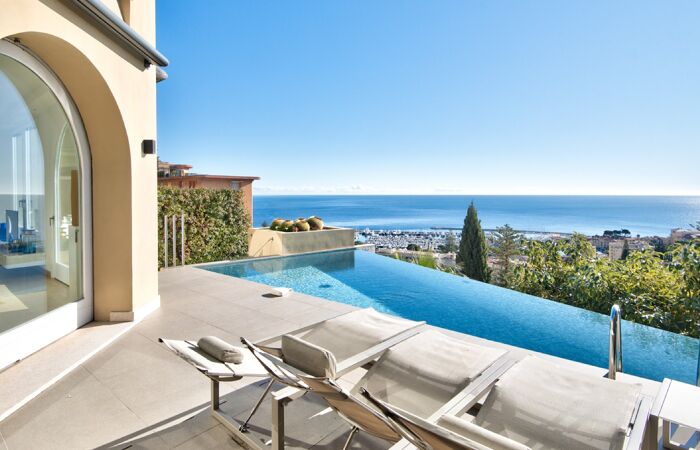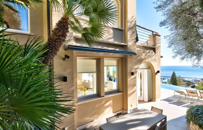 Élégante villa, idéalement située à quelques pas du centre de Beaulieu-sur-Mer et offrant une vue panoramique . Les espaces de vie, lumineux et harmonieux, comprennent un séjour et une salle à manger ouverts, ainsi qu'une cuisine entièrement équipée, le tout donnant sur une terrasse avec piscine.
