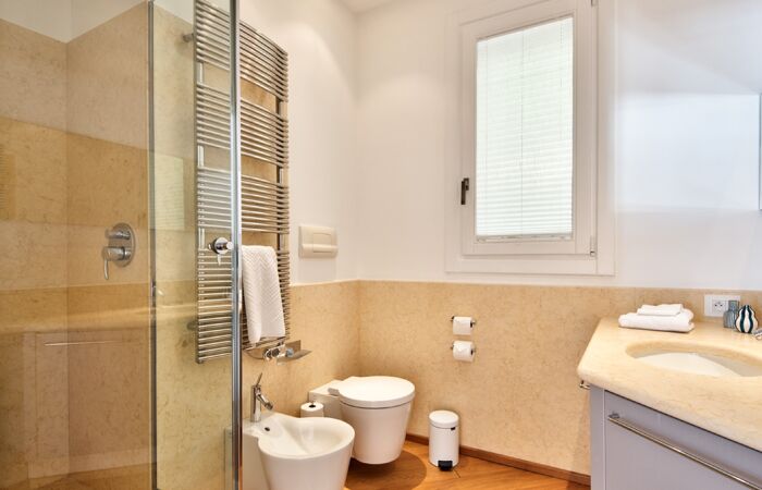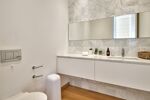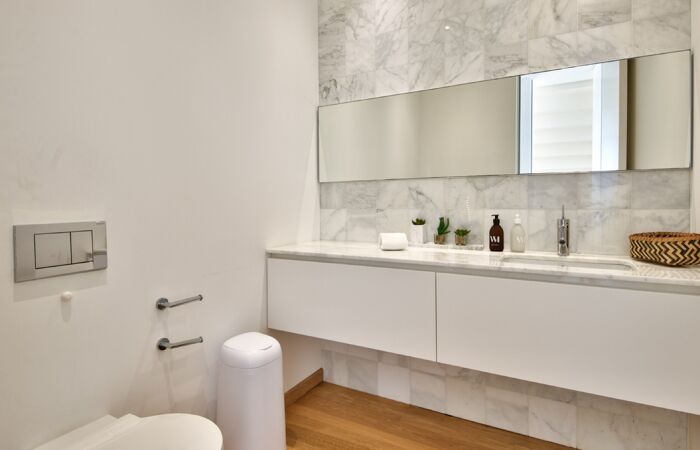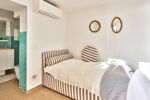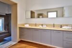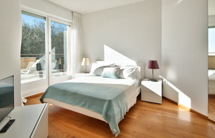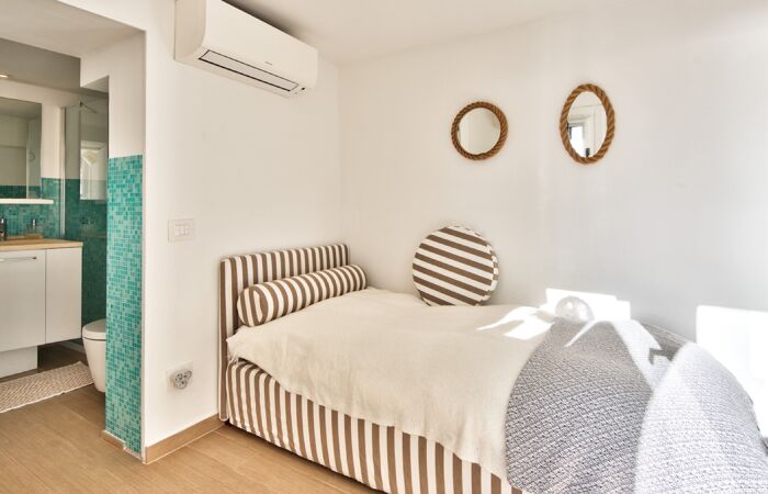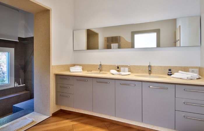 À l'étage, la villa propose trois chambres et deux salles de bains. La suite parentale, dotée d'une baignoire, d'une douche et d'un dressing, ainsi qu'une chambre d'invités, bénéficient d'un accès direct à la terrasse. Une quatrième chambre indépendante avec salle de douche complète cet ensemble.