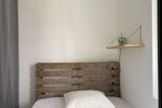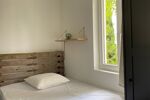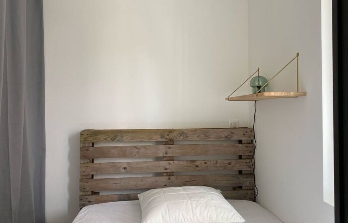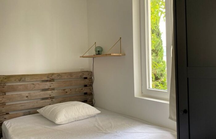 Pièce de vie avec coin cuisine équipée neuve (plaque vitro, hotte, frigo, rangements sur mesure) et un coin nuit au calme.