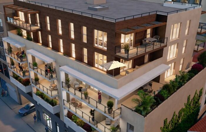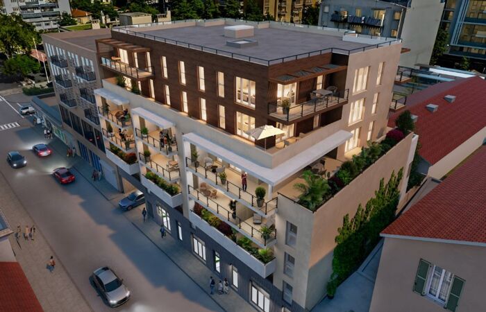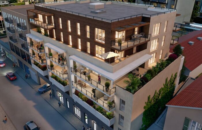La résidence s’intègre harmonieusement dans le quartier Saint Roch avec une architecture en R+6, les deux derniers niveaux étant conçus en attique, en retrait de la rue et des bâtiments mitoyens, afin d’alléger la perception volumétrique générale et de couronner le projet. Ses logements sont baignés de lumière.