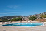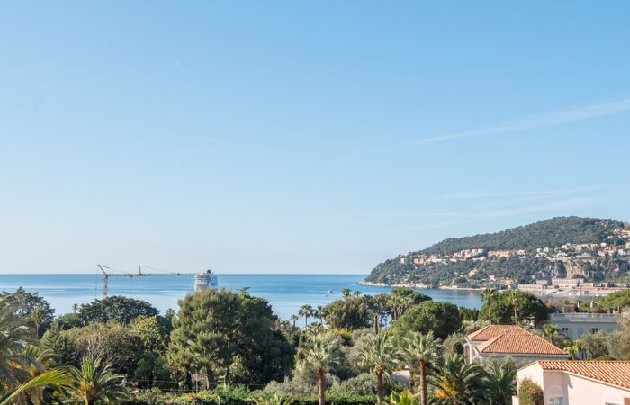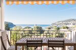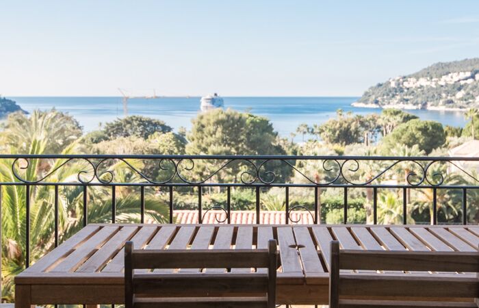 La pièce de vie s'ouvre sur une agréable terrasse, véritable prolongement de l'appartement, offrant une jolie vue sur les jardins paysagers et la rade de Villefranche, dans une atmosphère calme et préservée.