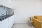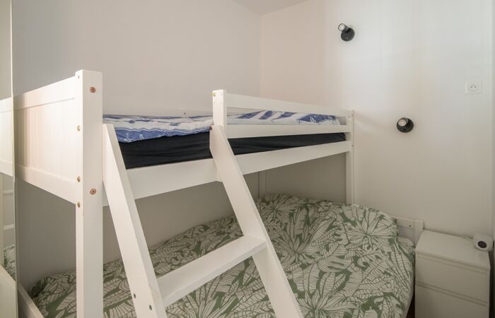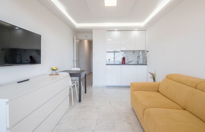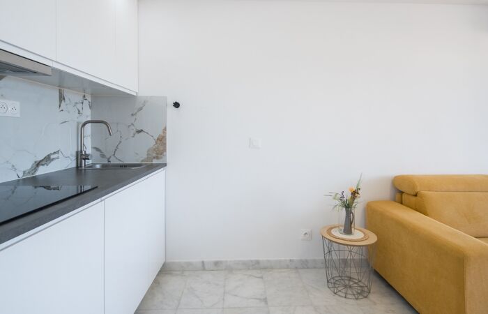 L'appartement se trouve au dernier étage et se compose d'un séjour élégant et lumineux avec cuisine américaine entièrement équipée, d'une chambre à coucher , ainsi que d'une salle de douche contemporaine aux finitions soignées.