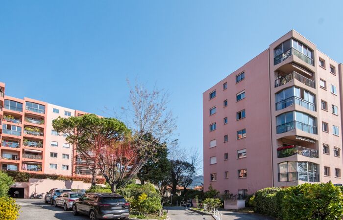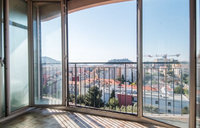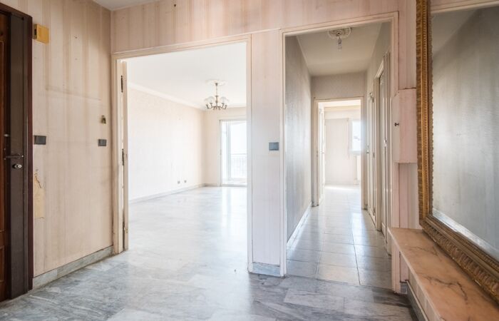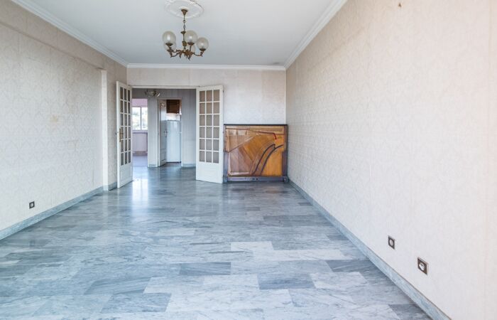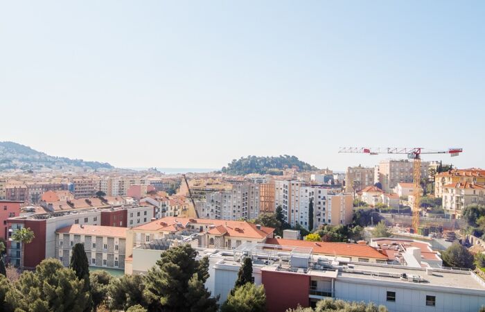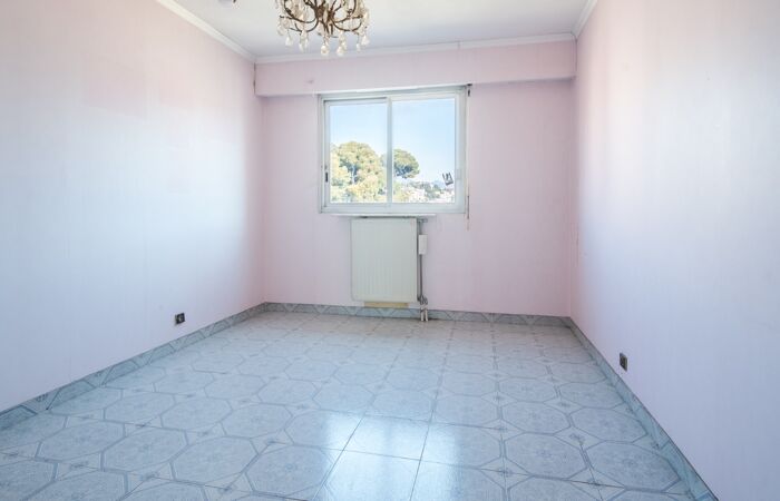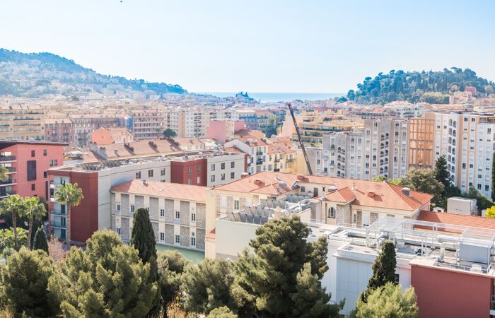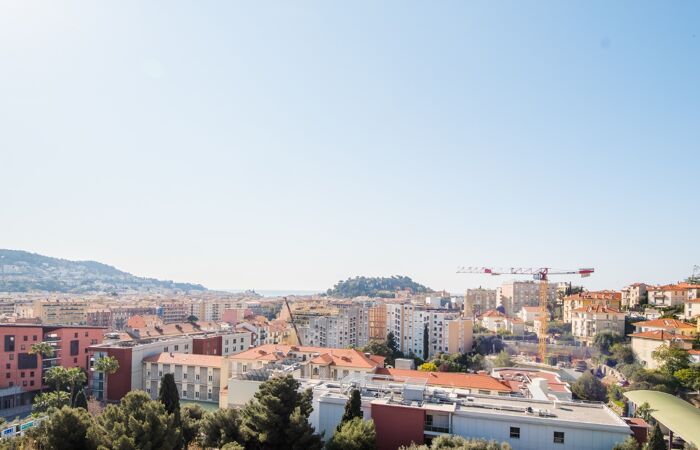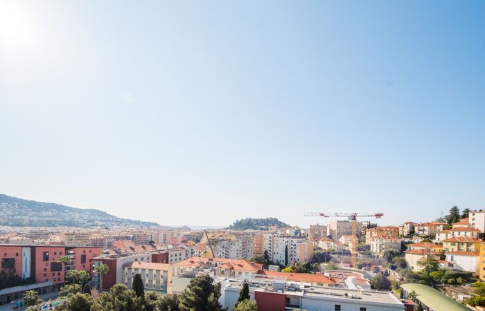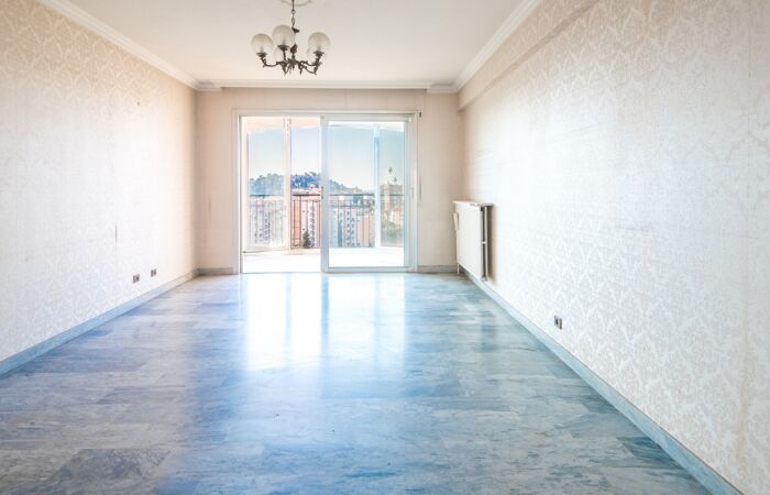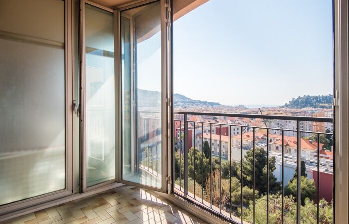 NICE EST : Dans une résidence de bon standing en dernier étage, très beau 3 pièces d'une superficie de 69 m² traversant avec terrasse en véranda et balcon en véranda. Très belle vue sur la ville, château et mer. Prévoir travaux de rafraichissement .
