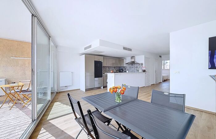Entièrement rénové avec des matériaux de qualité, cet appartement propose des prestations modernes et soignées. Il se compose d’un séjour lumineux avec climatisation gainable, ouvert sur une cuisine américaine aménagée et équipée, créant un espace de vie convivial et confortable.