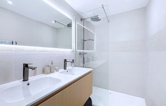 L’espace nuit comprend trois chambres avec de nombreux rangements, une salle d’eau moderne avec douche à l’italienne et double vasque, ainsi qu’un WC indépendant.