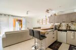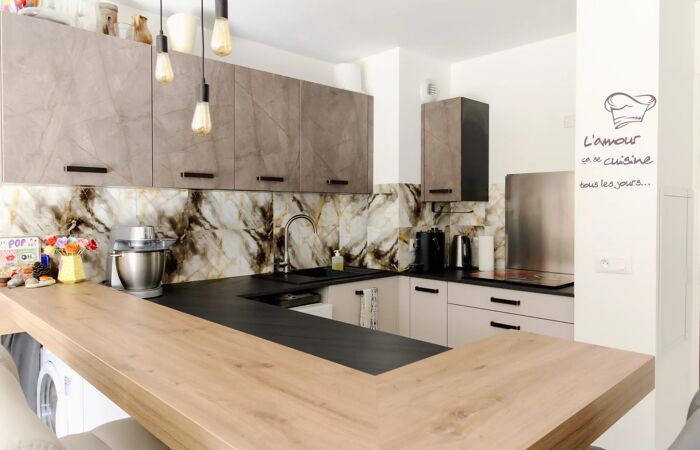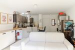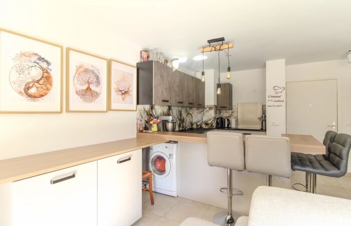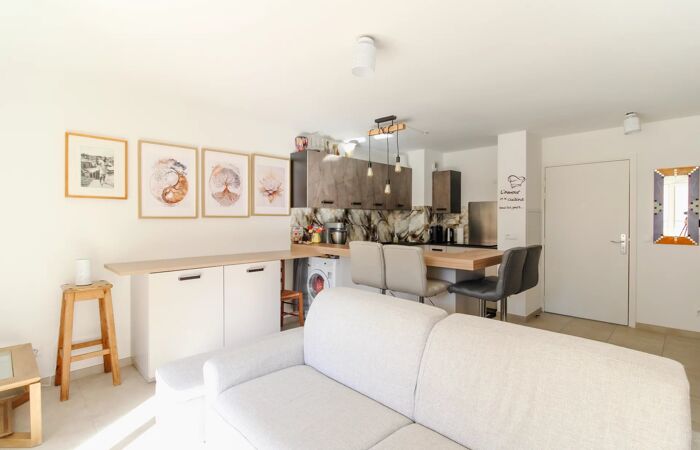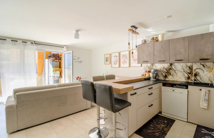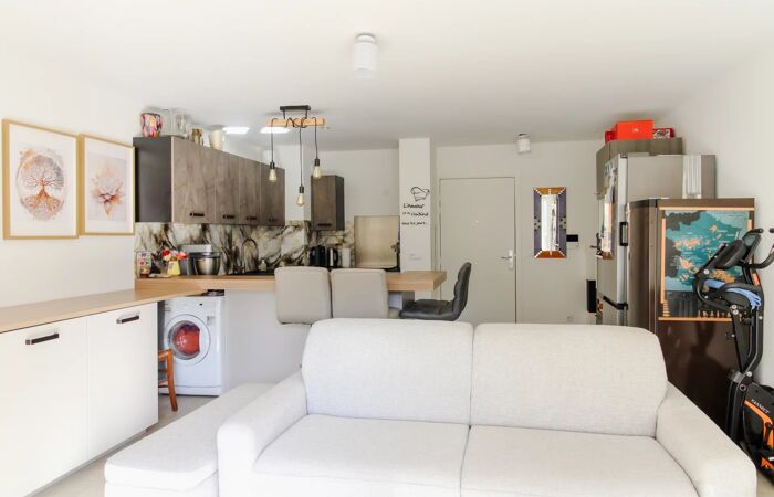 L’appartement se compose d’une cuisine américaine entièrement équipée et aménagée avec des prestations de qualité, ouverte sur un agréable séjour donnant sur l’extérieur.