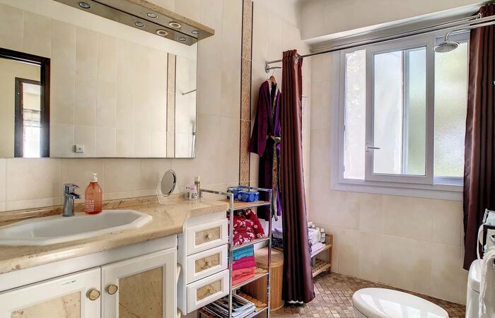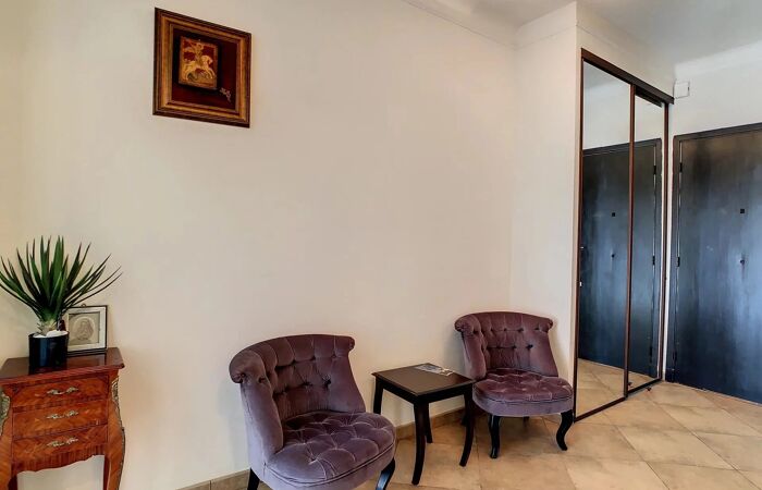 Il dispose d’un balcon/terrasse de 7 m² exposé plein Sud, offrant une agréable vue sur la verdure ainsi qu’une vue latérale mer.