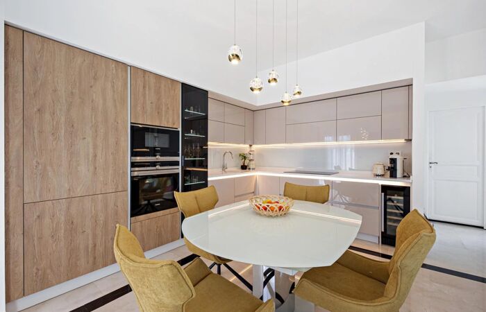 - Un vaste séjour de 43 m² avec une cuisine ouverte aménagée et équipée, ouvrant sur une belle terrasse d'angle vue mer.