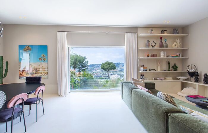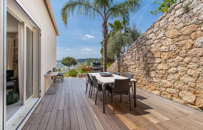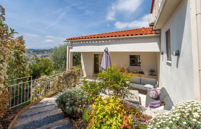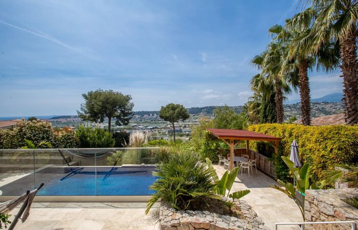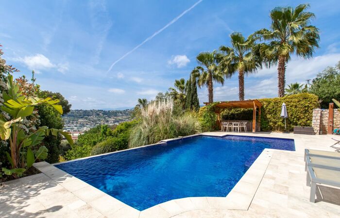 Nice Corniche Fleurie - villa 7 pièces - piscine - garages - vue dégagée verdure et mer . Située au cœur d’un domaine intimiste et sécurisé, dans le secteur recherché de Nice Ouest – Corniche Fleurie, cette villa contemporaine d’environ 186 m² édifiée sur un terrain de 1 500 m² constitue un véritable havre de paix.
