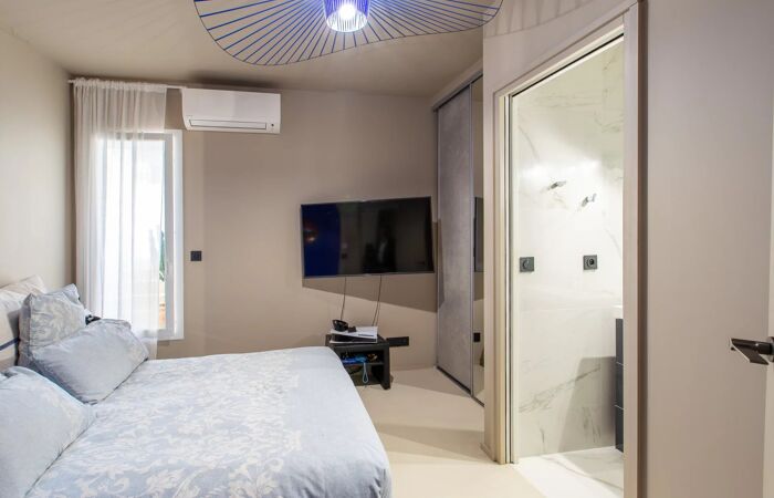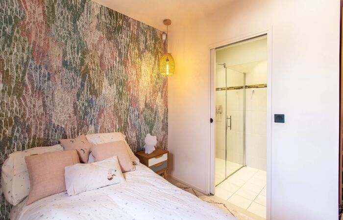 À l’étage, vous découvrirez deux chambres climatisées en suite parentale ainsi qu’un bureau, offrant un espace nuit confortable et parfaitement agencé.
