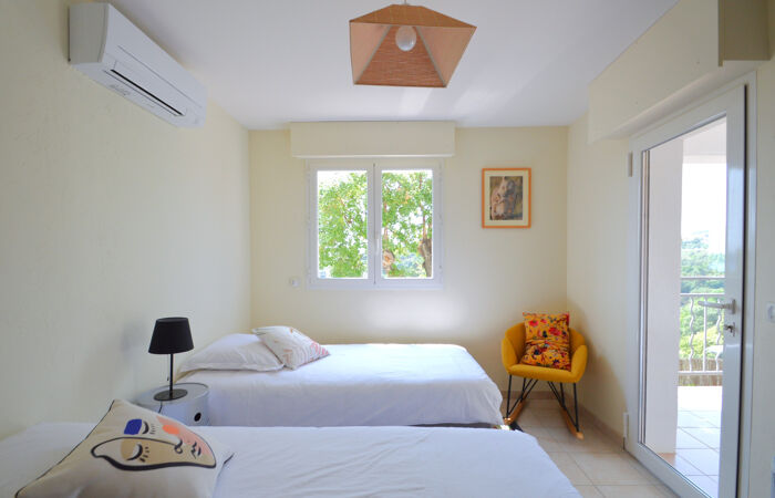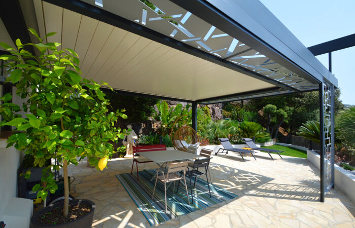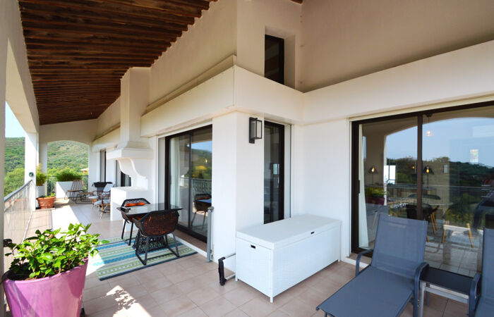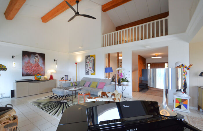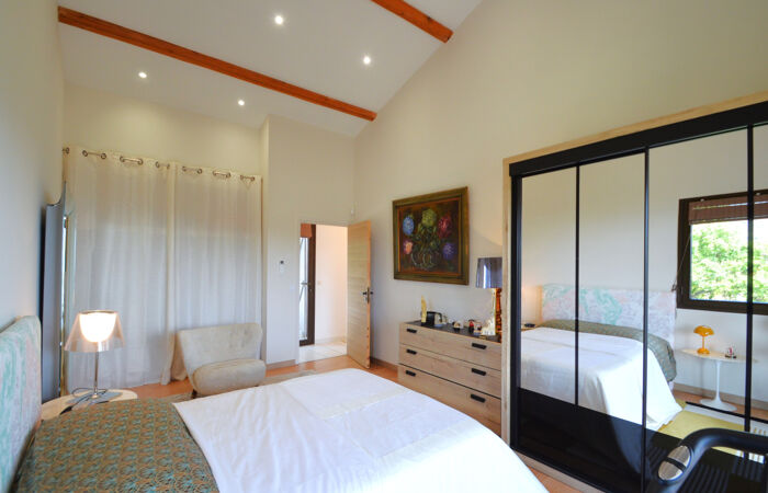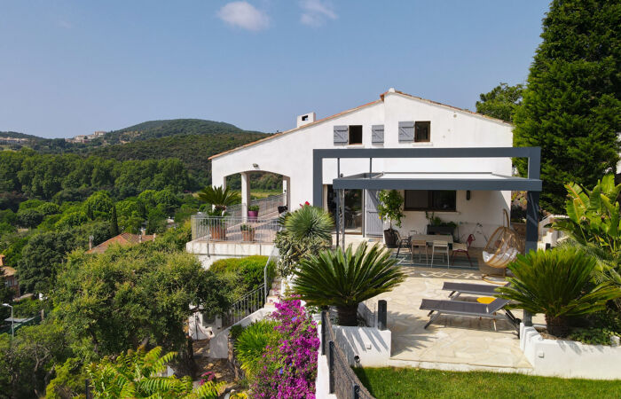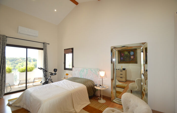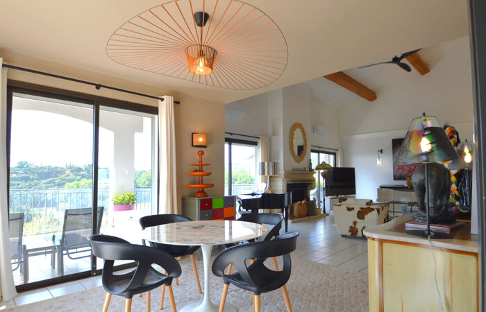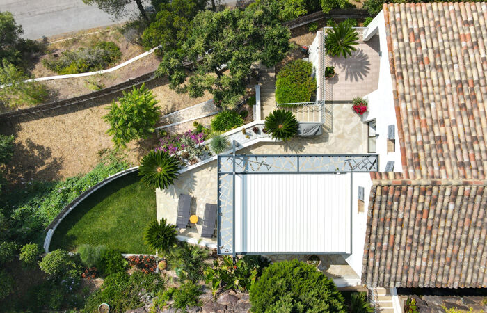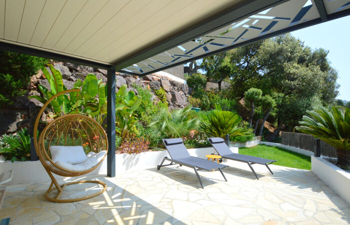 Située en position dominante, exposée Sud face à la baie d'Agay, cette belle villa de 300m2 à l'allure moderne profite d'une vue mer et d'un superbe panorama depuis toutes les pièces de vie et les terrasses, sur une parcelle piscinable de 1370m2. Cette villa de standing bénéficie au niveau principal d'un living cathédrale de 55m2 prolongé d'une cuisine américaine entièrement équipée haut de gamme, le tout ouvrant sur terrasse avec pergola bioclimatique de 30m2. Coté nuit une confortable chambre avec sa salle de bains attenante offre un espace dédié au repos sur 31m2. Le niveau supérieur de la maison comporte un espace bureau, une chambre et une salle d'eau. Au niveau inférieur se trouve un appartement de 4 pièces de plus de 100m2 avec terrasse ayant la possibilité d'être totalement indépendant. Les multiples terrasses complantées procurent une ambiance charmante avec une ouverture à 180o sur l'environnement.