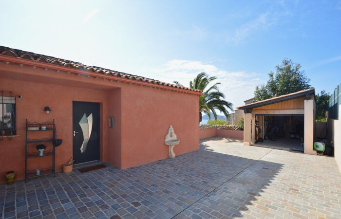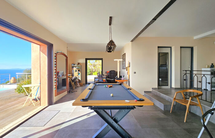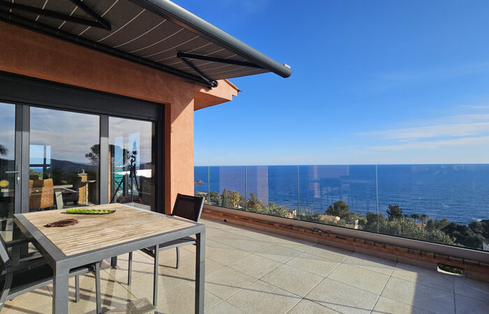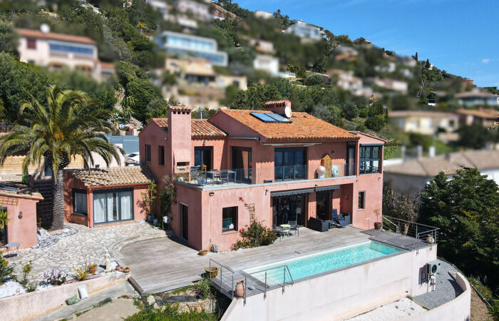 Située en position dominante dans le quartier d'Anthéor avec une magnifique vue mer, cette propriété rénovée est établie sur un terrain de 1446m2 et profite d'une ouverture à 180o sur l'horizon Méditerranéen lui offrant un panorama d'exception jusqu'à Saint-Tropez. La villa d'une surface de 237m2 incluant les dépendances se compose d'une partie à vivre sur 215m2 environ, comportant notamment 3 chambres climatisées dont une suite parentale de 40m2, une cuisine moderne ouvrant sur terrasse, un séjour de 67m2 avec chauffage au sol prolongé d'une spacieuse terrasse agrémentée d'une piscine chauffée type couloir de nage de 9 x 2.25m avec volet. Un annexe de 10m2 environ permet d'accueillir un bureau ou une chambre d'amis. Un garage à moto, des parkings et un carport fermé viennent en complément. La villa profite également d'une cave et de combles pouvant servir d'espaces de rangement annexes et d'un jardin en restanques aménagées.