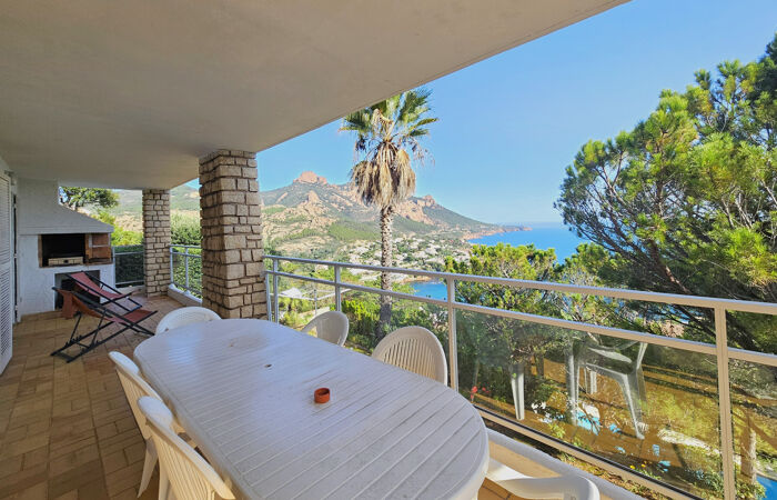 Située en position dominante avec une vue mer incroyable et surplombant la baie d'Anthéor cette belle villa à l'allure moderne, de 206m2 et 7/8 pièces, avec piscine s'octroie un panorama spectaculaire sur le massif du Cap Roux. La maison rénové et répartie sur deux niveaux profite de beaux volumes ainsi que d'ouvertures intéressantes offrant luminosité et transparence. Avec de belles terrasses et une véranda orientée vers les levés de soleil la villa se dote de formidables espaces extérieurs complantés. La communication entre les niveaux s'effectue par l'intérieur ou par l'extérieur et donne la possibilité de vivre dans deux appartements indépendants. Le jardin est entièrement paysagé avec une multitude d'essences et de remarquables restanques en pierres, il accueille également un pool house.