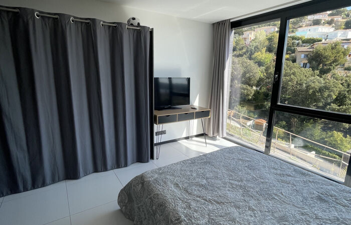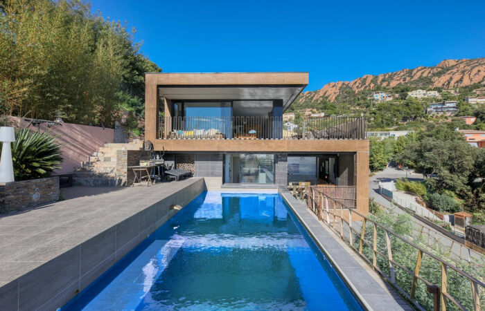 Située sur les hauteurs d'Agay, au coeur d'un domaine privé, cette villa contemporaine de 6 pièces offre une surface habitable de plus de 200 m2. Elle se compose dans sa partie principale, d'un superbe séjour avec vue panoramique, ainsi que de deux chambres principales dotée de salles de bain et d'un dressing.