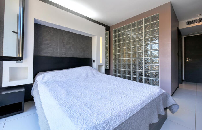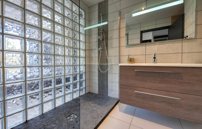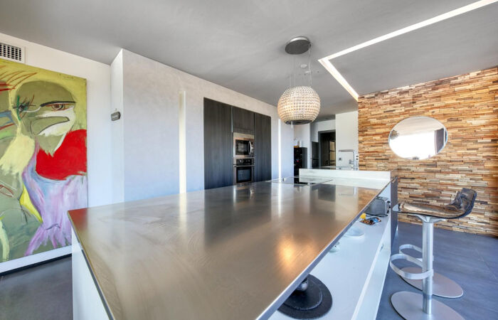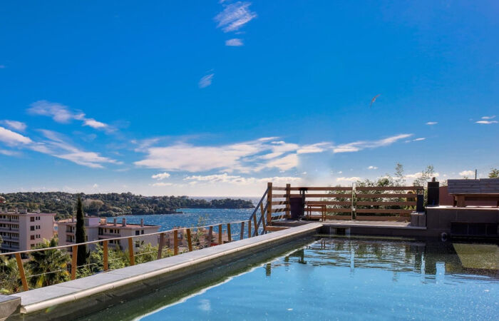 Elle bénéficie d'un terrain de 1200 m2, d'une piscine à débordement et son garage peut accueillir deux voitures aisément.