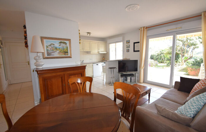 EXCLUSIVITE ! Quartier Boulouris, dans une résidence de standing sécurisée, très agréable 2 pièces de 47 m² prolongé d'une vaste terrasse et d'un joli jardinet paysagé. Cet appartement est composé d'une entrée, une cuisine ouverte sur le séjour, une chambre avec accès direct sur la terrasse, une salle d'eau et un WC indépendant. L'appartement bénéficie d'une belle exposition et offre une vue dégagée. Votre agence Millésime Immobilier Boulouris vous propose cet appartement au calme et proche des commodités. Lumineux, grâce à une exposition Sud, ce T3 est équipé de la climatisation et complété par une cave et parking.