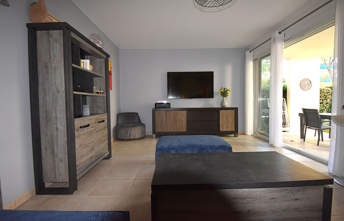 EN EXCLUSIVITE ! Saint-Raphaël, quartier Boulouris, dans une résidence sécurisée avec beau parc paysagé, piscines et gardien, appartement 2 pièces de 52 m² en rez-de-jardin. Ce T2 est composé d'une entrée desservant un salon séjour avec cuisine ouverte, une chambre, une salle de bains et un WC indépendant. Une vaste terrasse et un jardinet agrémente cet appartement. Votre agence Millésime Immobilier Boulouris vous propose ce bien avec de belles prestations, la climatisation réversible et un garage en sous-sol. A pied de la mer et des commerces dans le quartier très prisé de Boulouris.