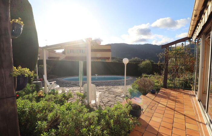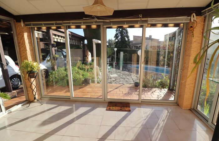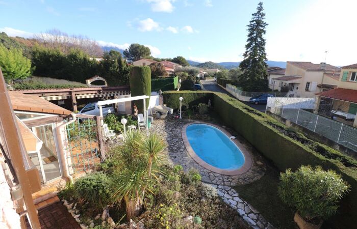 Située au calme dans un peu lotissement sans charges, maison mitoyenne par le garage de type 5 pièces d'une surface de 130 m² avec piscine sur une surface de terrain de 600 m² environ.