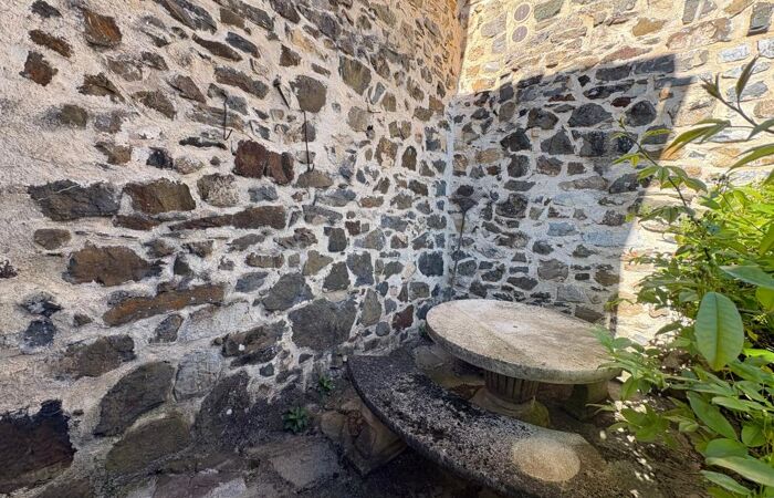 A l'extérieur on trouve un espace pour déjeuner avec une belle table en pierre.