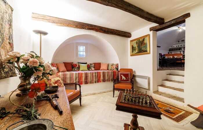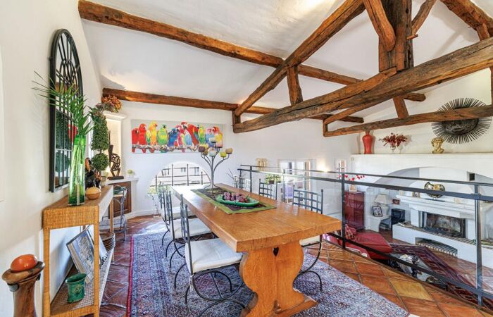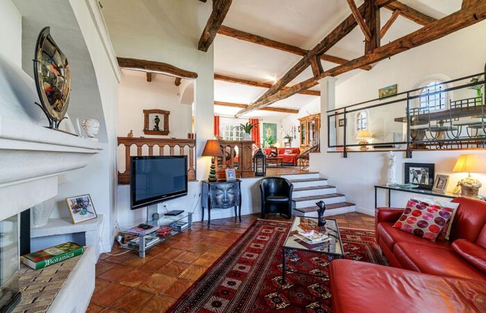 Sublime triple séjour "cathédrale" de 90 m² avec poutres apparentes, cheminée et sol en terre cuite. Une hauteur sous plafond impressionnante pour un charme intemporel !