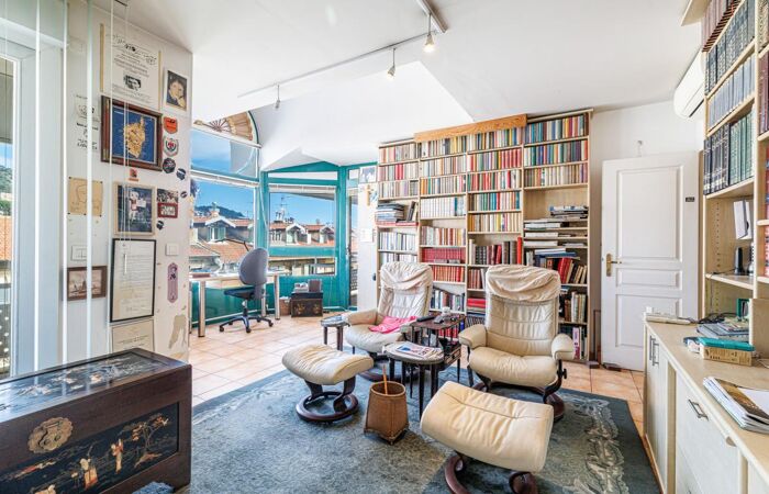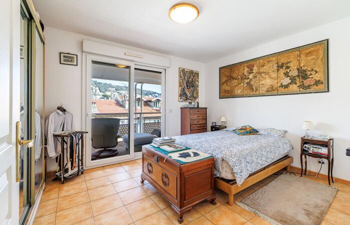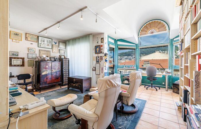 Composé d'un vaste séjour cathédrale de 36m2 auquel s'ajoute une belle mezzanine de 20m2, de 3 chambres à coucher, dont une "en suite", 2 salles de bains, toutes les pièces de cet appartement traversant Est / Ouest donnent sur des terrasses, soit celle de 35m2 orienté Ouest avec vue colline du Château, soit 2 autres situées côté quartier Port avec vue collines Mont Boron et échappée mer.